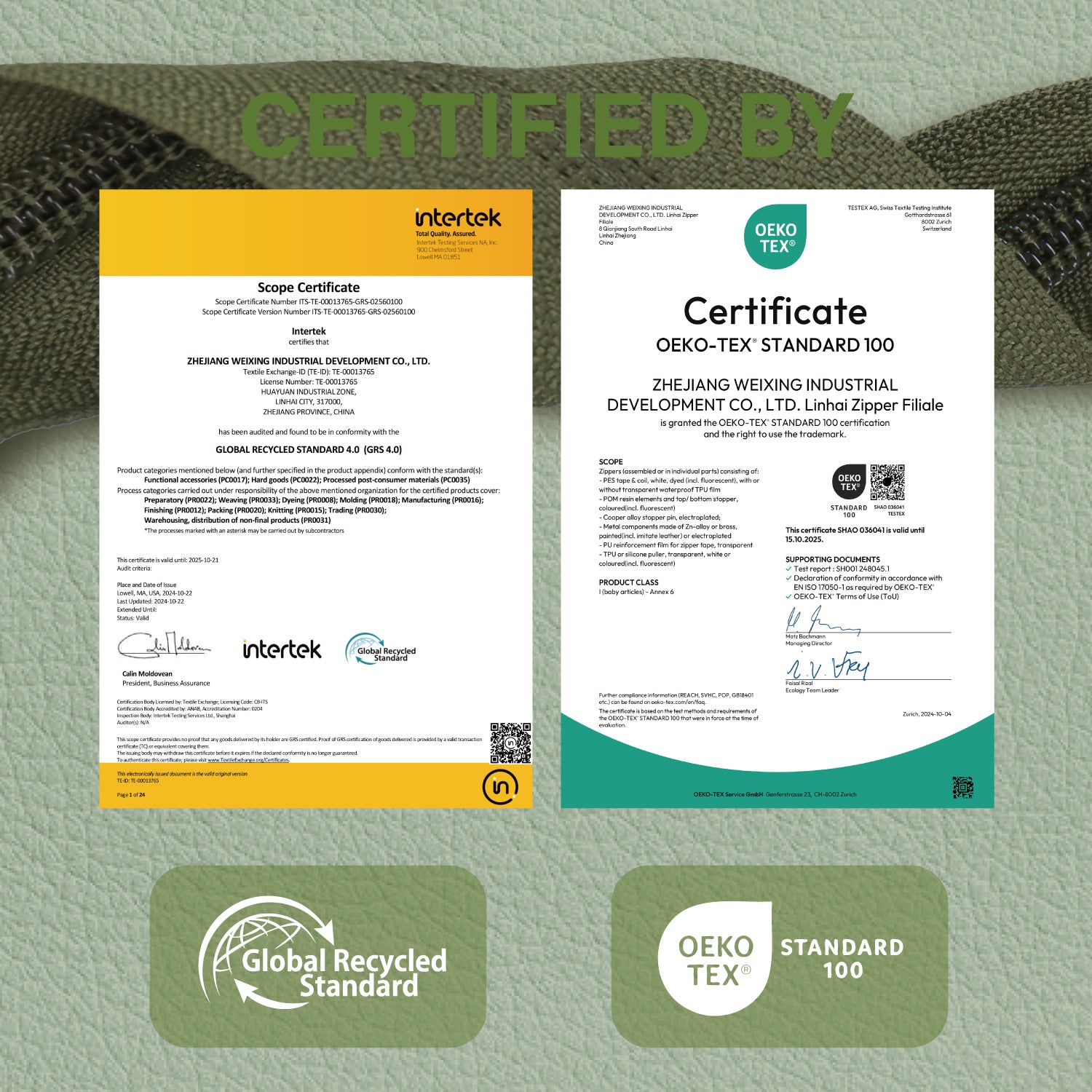 This zipper is certified by GLOBAL RECYCLED STANDARD 4.0 (GRS 4.0) and OEKO-TEX STANDARD 100.
