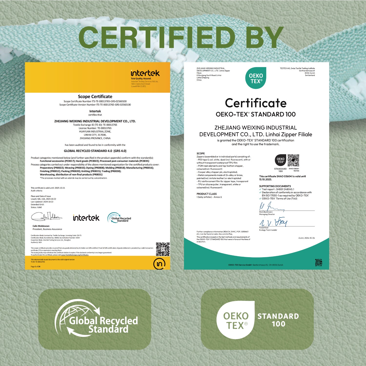 This zipper is certified by GLOBAL RECYCLED STANDARD 4.0 (GRS 4.0) and OEKO-TEX STANDARD 100.