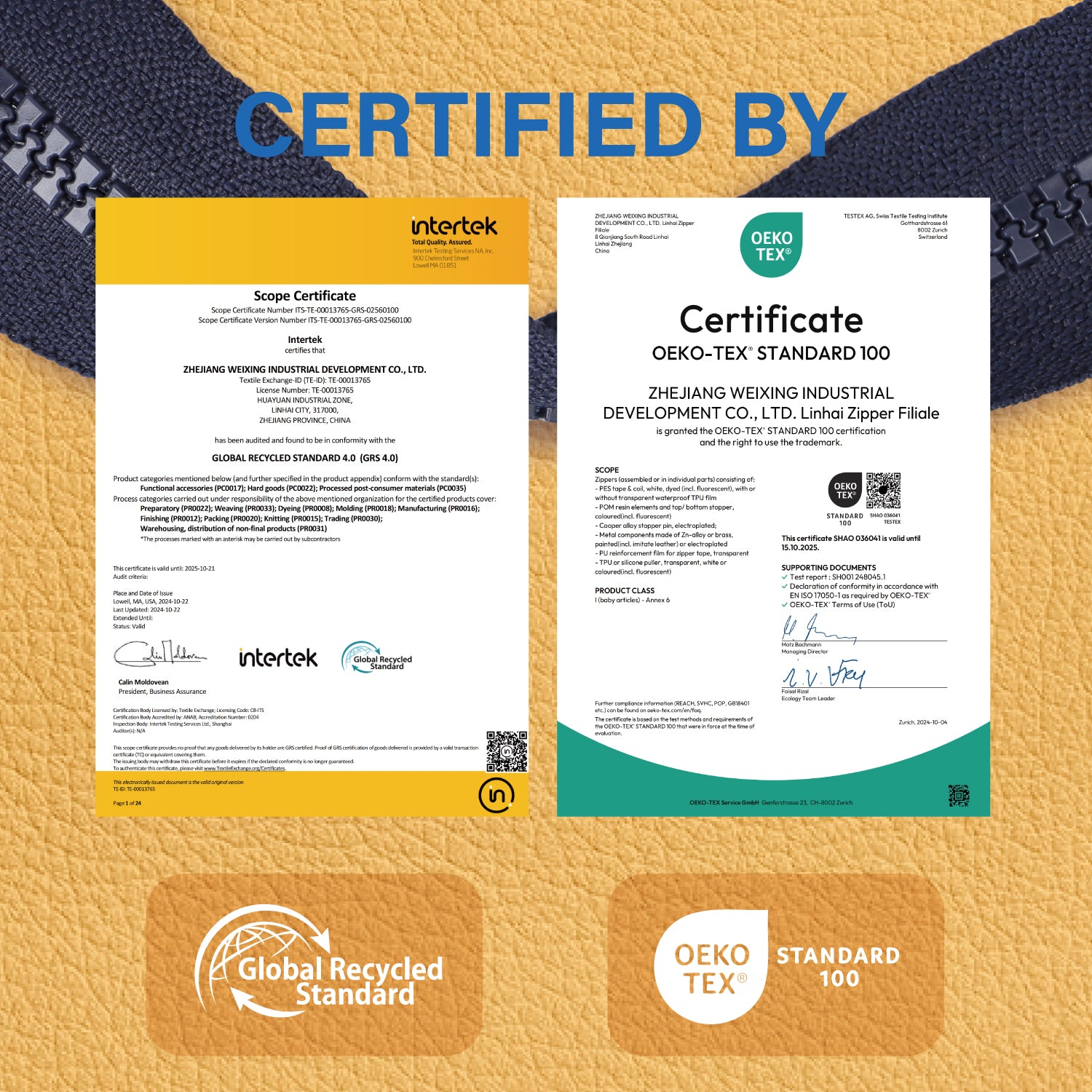 This zipper is certified by GLOBAL RECYCLED STANDARD 4.0 (GRS 4.0) and OEKO-TEX STANDARD 100.