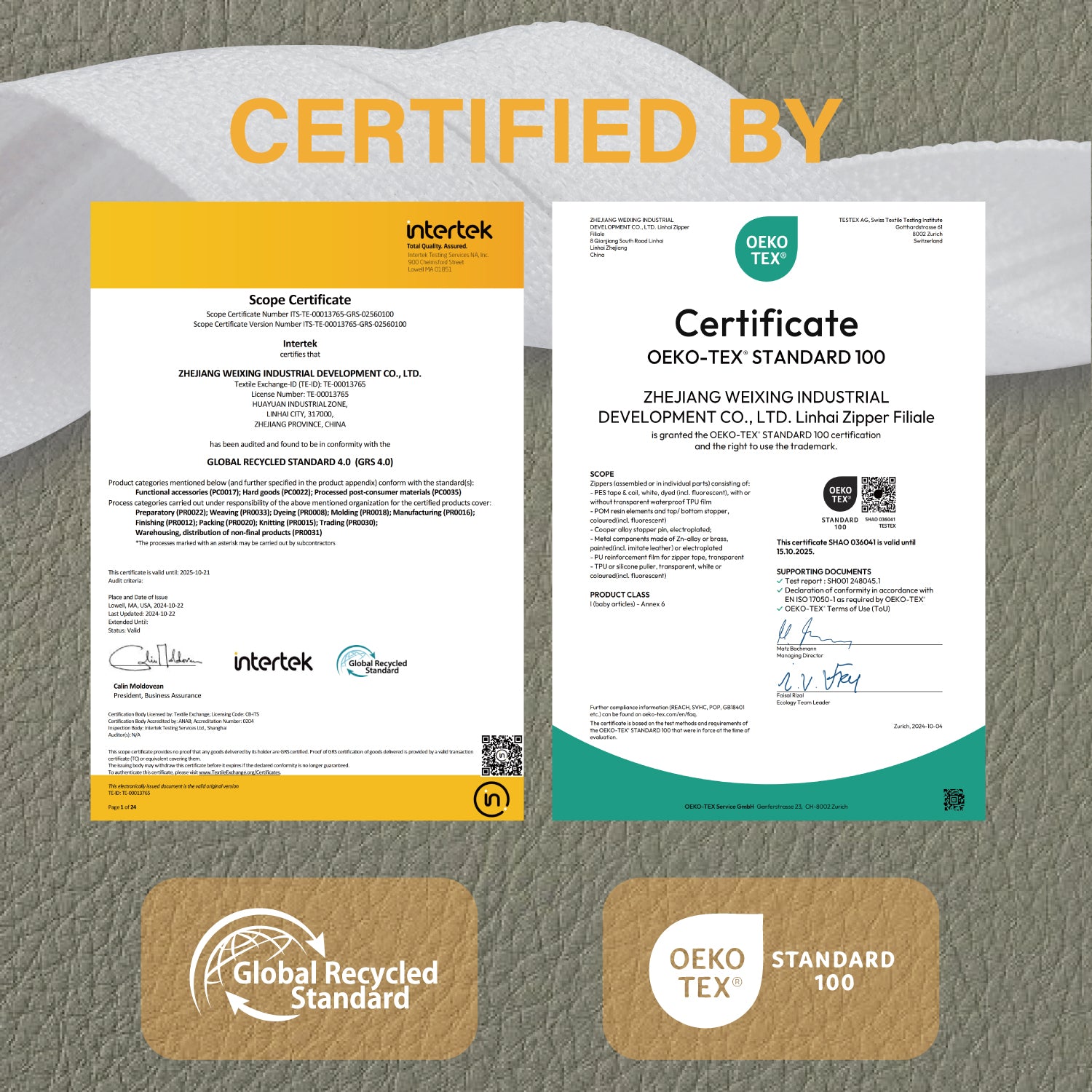 This zipper is certified by GLOBAL RECYCLED STANDARD 4.0 (GRS 4.0) and OEKO-TEX STANDARD 100.