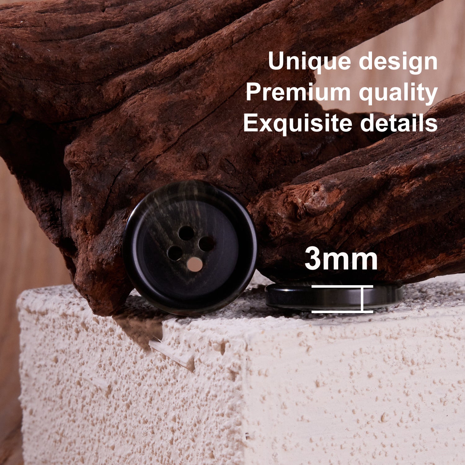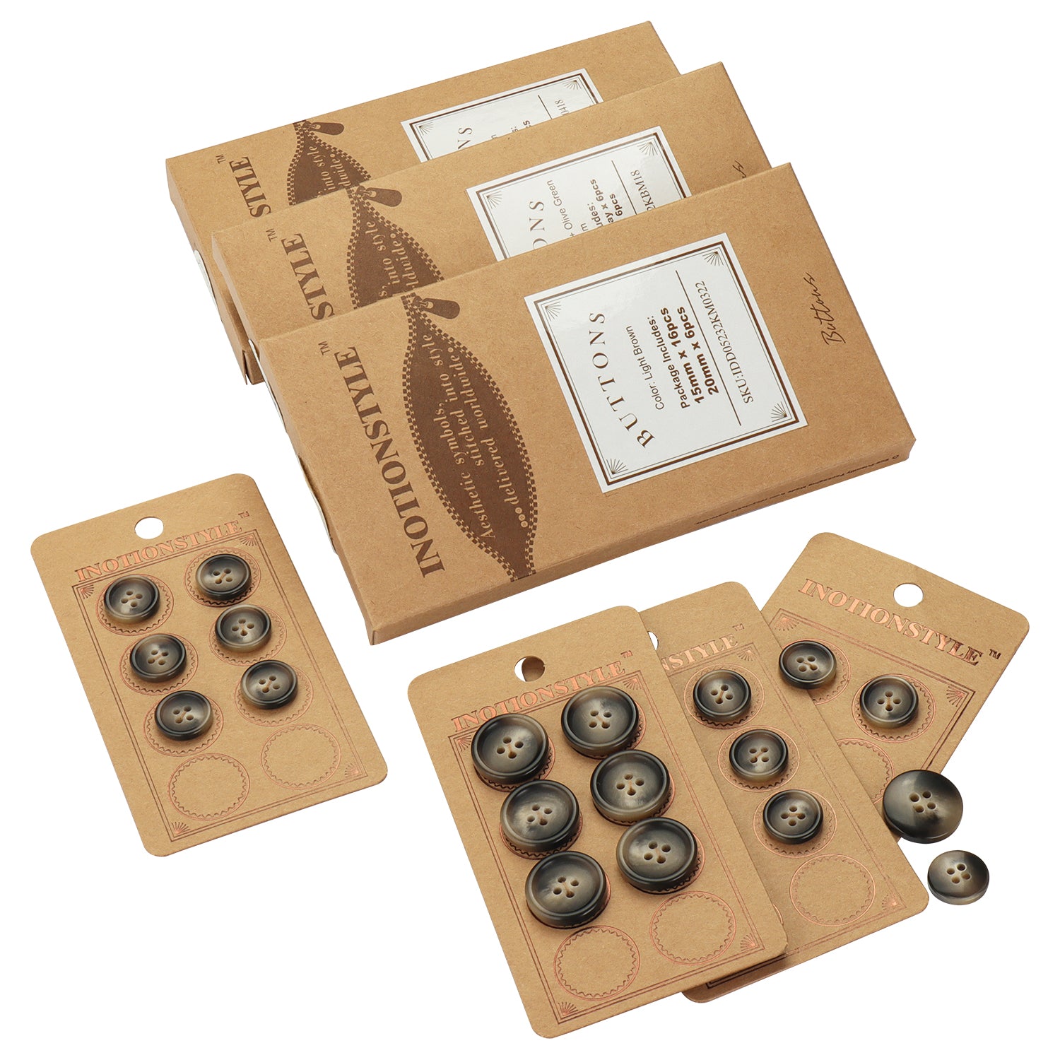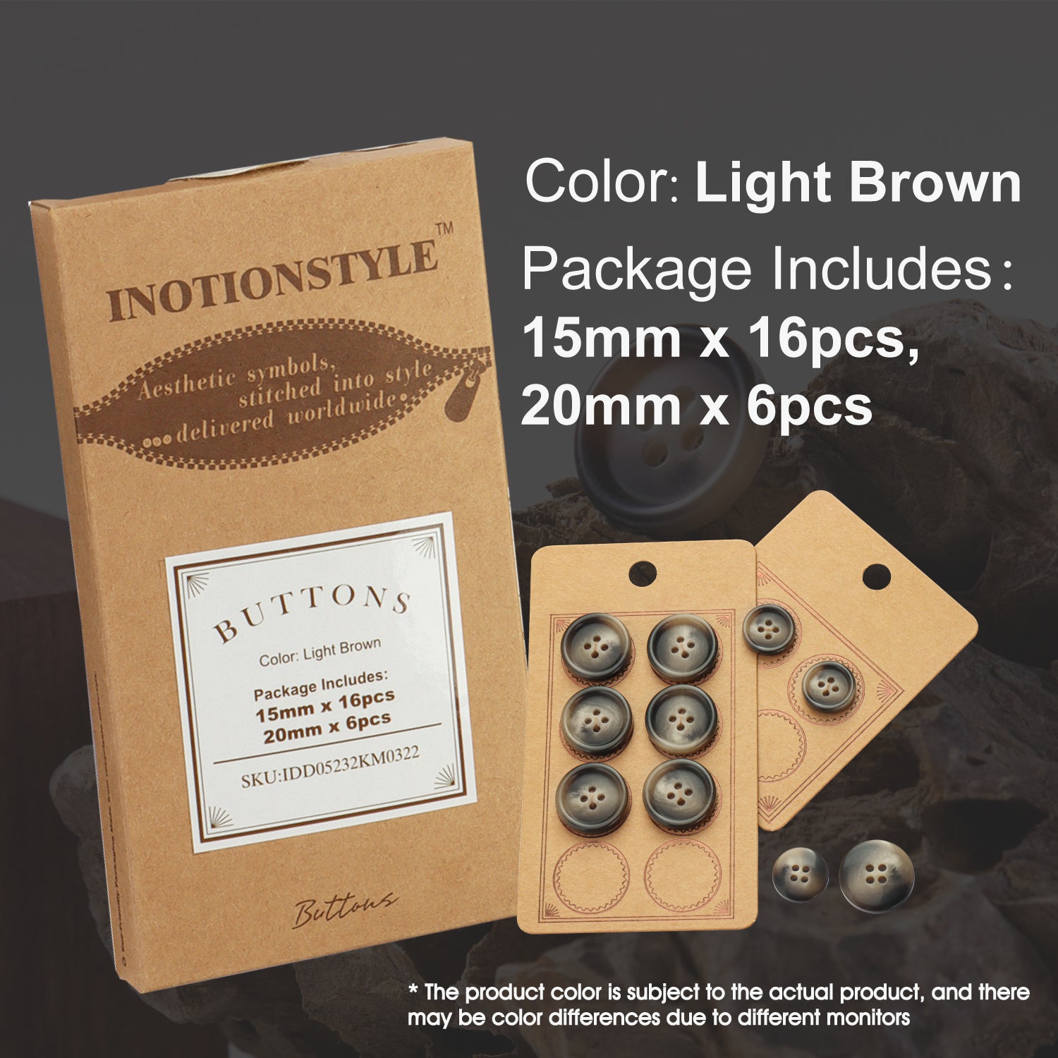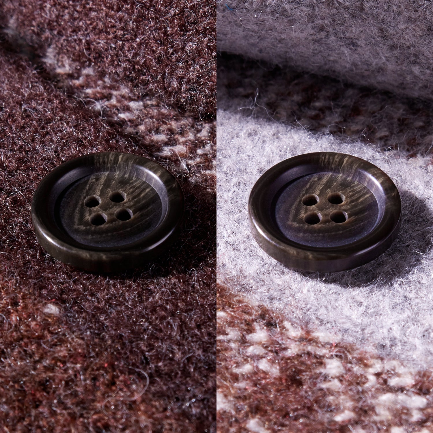 The INOTIONSTYLE Buttons Set is a premium collection of buttons, ideal for enhancing the look of blazers, suits. We offer custom design services, allowing you to personalize these buttons to match your unique style. With a smooth, glossy surface and a luxurious texture, these buttons feature a natural gradient in shades of light brown, dark brown, and black. Their elegant finish and polished edges add a refined touch to any garment, making them a standout feature in both professional and DIY projects.