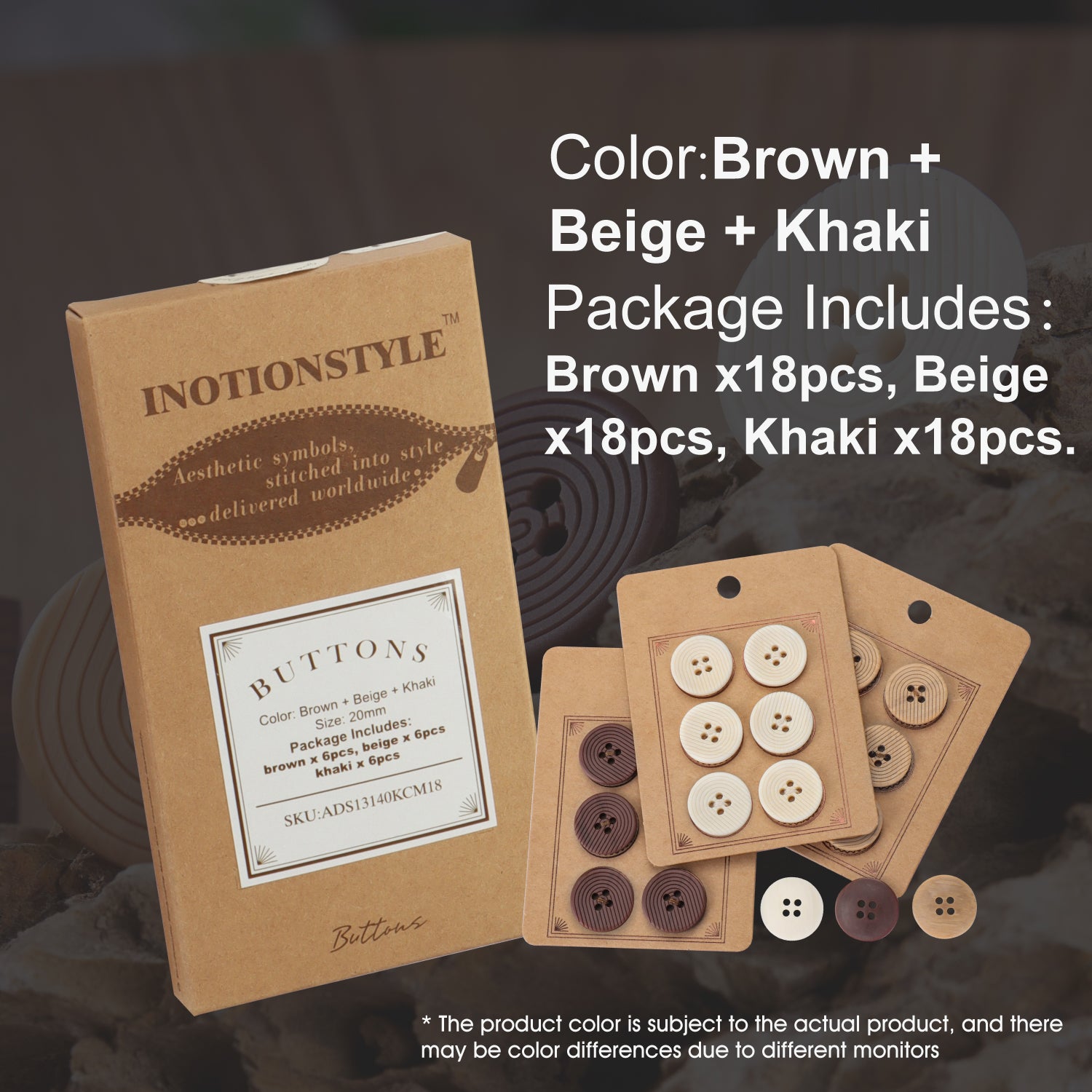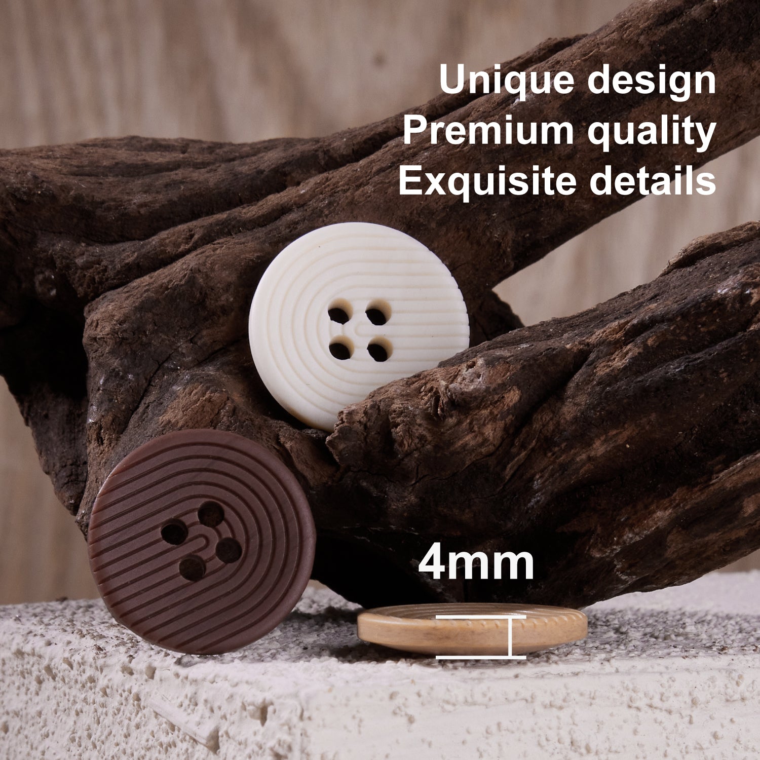 These INOTIONSTYLE buttons feature a striking spiral groove pattern, adding a unique texture to garment. Available in natural beige, warm Khaki, and rich brown, they blend seamlessly with both classic and modern fashion styles. Crafted with a smooth yet textured finish, these buttons are suitable for sweaters. Their sturdy 4-hole design ensures long-lasting durability, while the grooved surface provides a stylish and eye-catching detail. We also offer customization services to meet specific design needs, ensuring a ideal match for your style.